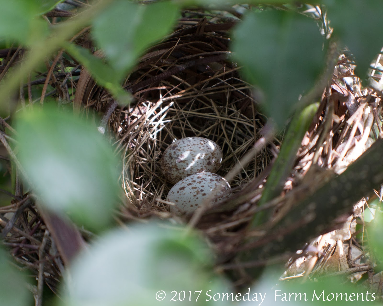 Outside our bedroom window, a cardinal has set up nest in a holly bush.