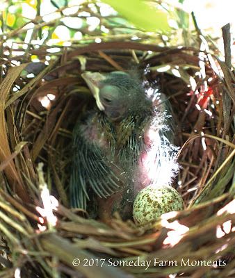 The cardinal baby is sure growing! Only a week old and he is getting more feathers and has more than doubled in size! I cannot believe he fit into an egg that small just a week ago! His eyes are open now and we see mom and dad cardinal fly back and forth from the bird feeder to the nest to feed the baby. Sure is fun watching him grow!
