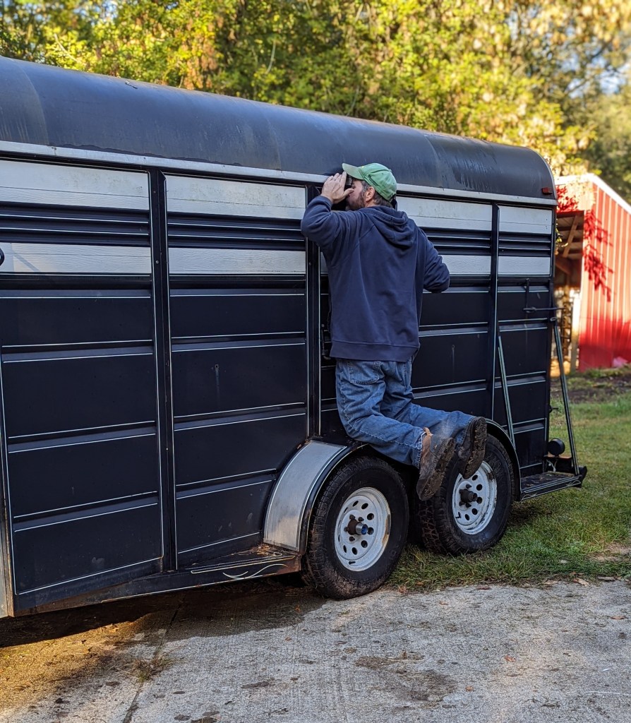 We did not anticipate Delilah being the stubborn one, but she was the most reluctant to go. David finally got her close enough to the trailer with me providing minimal back up, he pushed and squeezed until she was three hooves inside. James held gates from the safety of outside the pen and I held the trailer door as shut as possible while we waited for her to lift her last stubborn hoof up and into the trailer. The moment she did, David shut and latched the hinged door with a clang and in that same heartbreaking instant, James’ alarm sounded, reminding him to take his morning dose of cancer meds. The “what” and “why” of this terrible moment resounding in our ears. As the boys walked away, I stood with my head against the trailer and sobbed.
